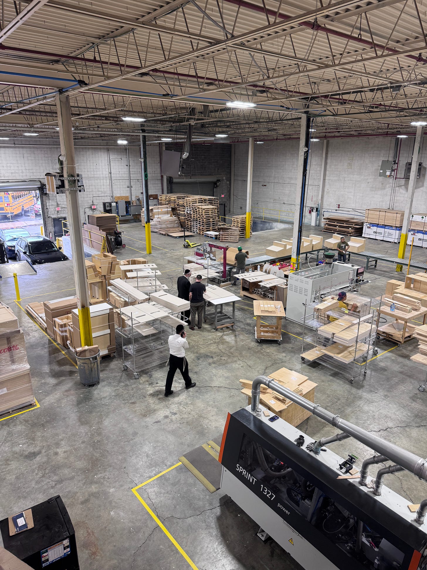 (Photograph from Euro Cabinet’s assembly facility, depicting the final stages of an order for the labor and delivery department of a hospital in the New York metropolitan area.) The facility is laid out in a square ‘line’, anchored by an elevated management office in the middle of the production ‘line’ rather than in linear production lines.)